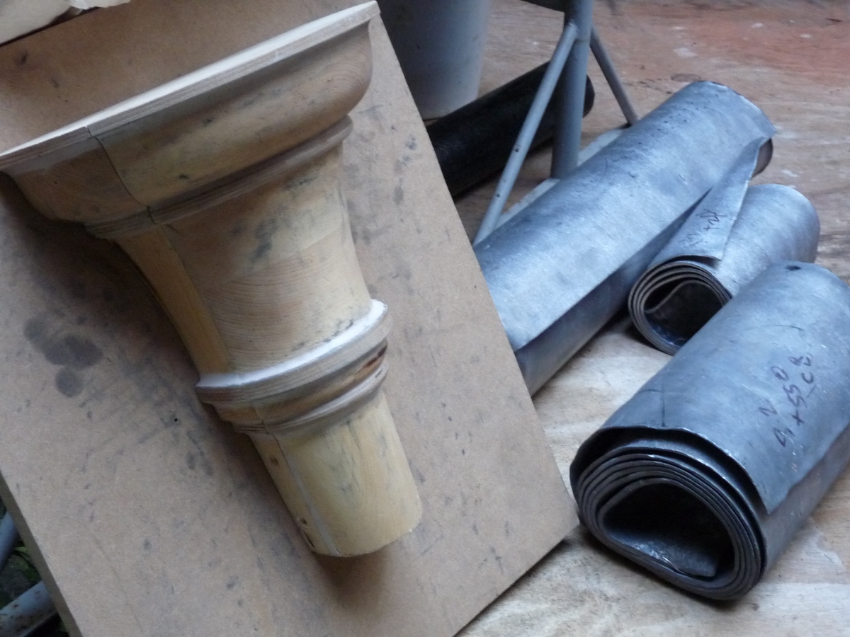 Lead is the perfect material to repair. It is possible to cut out a damaged section and insert a matching new piece (sand-cast or milled, as appropriate) to produce an invisible joint. Soldering and solder wiping are often used here and for making good small splits and pin-holes in decorative work. Where a rainwater head is in very poor condition, a new lead reservoir can be made and placed inside, with suitable reinforcement. Occasionally, a case exists for re-shaping distorted leadwork, such as when a piece no longer functions as intended (obstructing water flow etc). Work may also entail casting new parts or replacement of corroded wrought iron armatures with stainless steel.