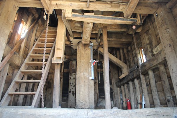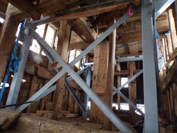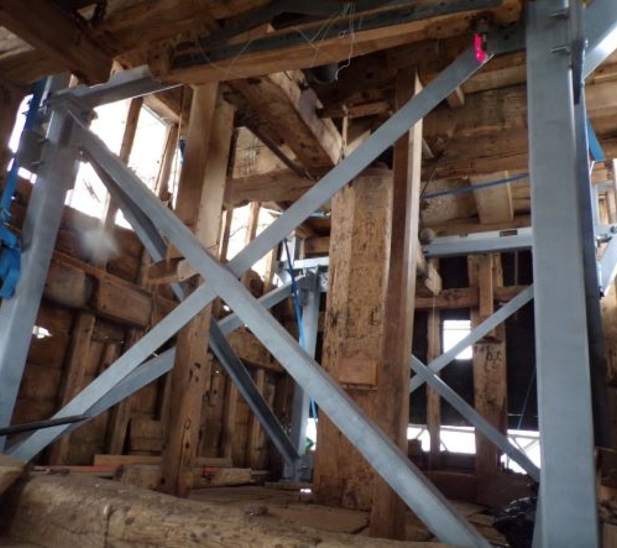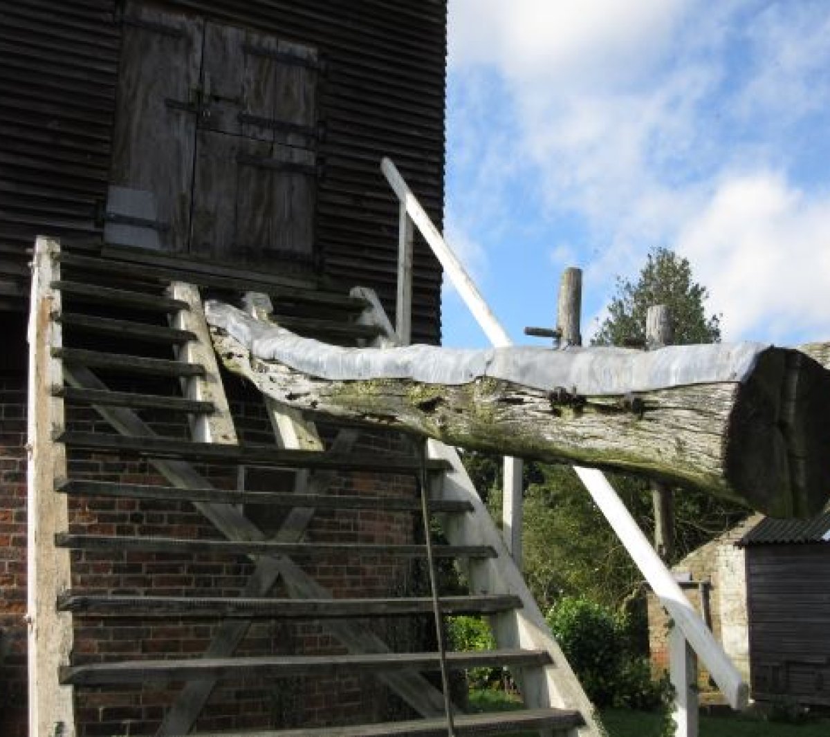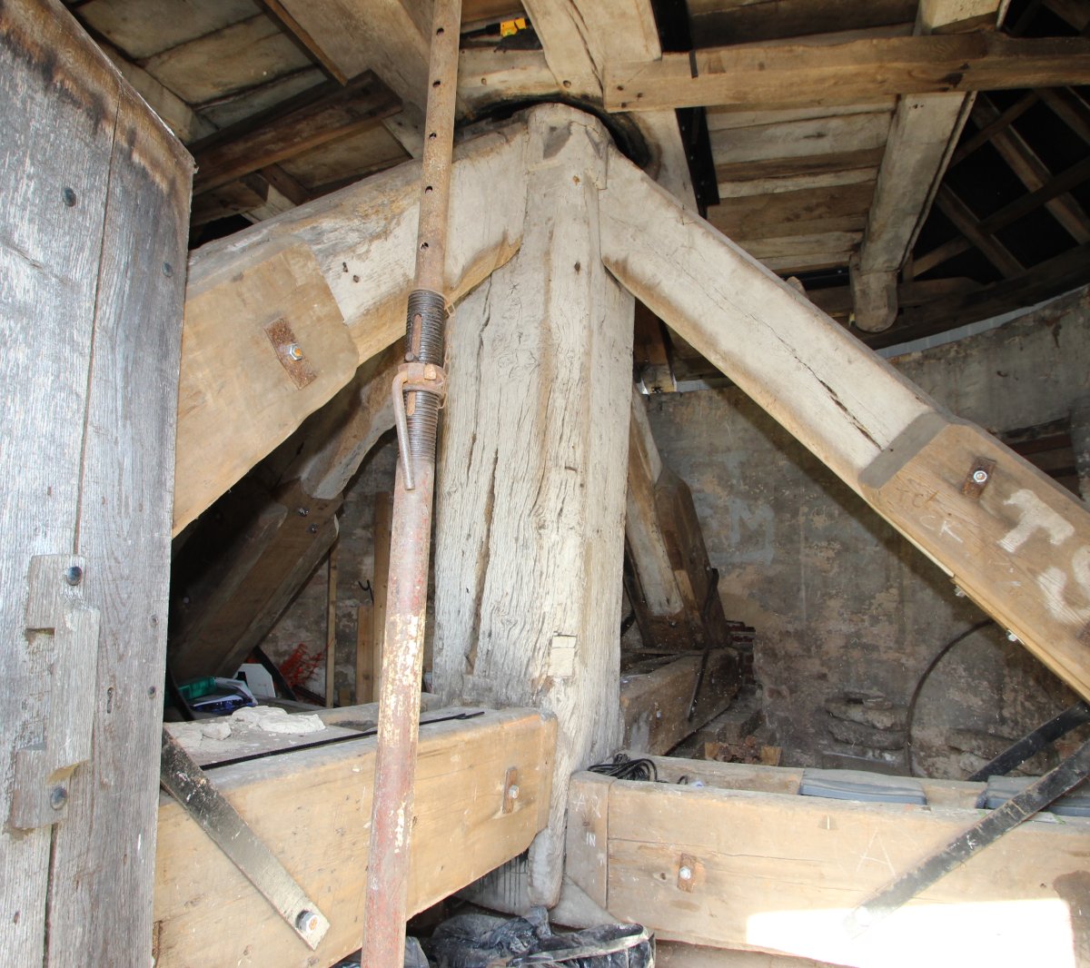 We contracted Millwrights Dorothea Restorations to undertake most of the repair work. They lifted up the 15-tonne buck (body of the mill) on a temporary steel support frame so they could repair the severely decayed original oak trestle (substructure of the mill) beneath it.