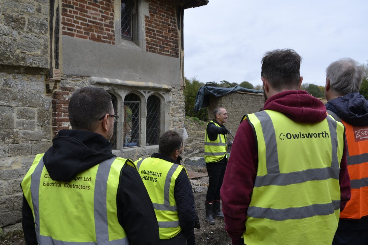 The first group contained representatives of the Kent Archaeological Society (KAS) and was linked to a SPAB talk on the OHP at their annual conference. KAS have been valued supporters of the OHP and of Boxley Abbey Working Parties, providing voluntary help as well as a financial contribution to archaeological work. Their involvement has greatly helped our understanding of the site overall. At their visit in October they saw recent finds, including the base of a vessel that is possibly Roman, as well as a newly discovered section of wall which provides further evidence that the site was in monastic use before the construction of the current chapel, which dates from the 1480s. We were delighted that the visiting group included David and Barbara Martin who are highly-respected experts in the historic buildings of Southeast England and who have studied Boxley’s daughter house, Robertsbridge Abbey.
