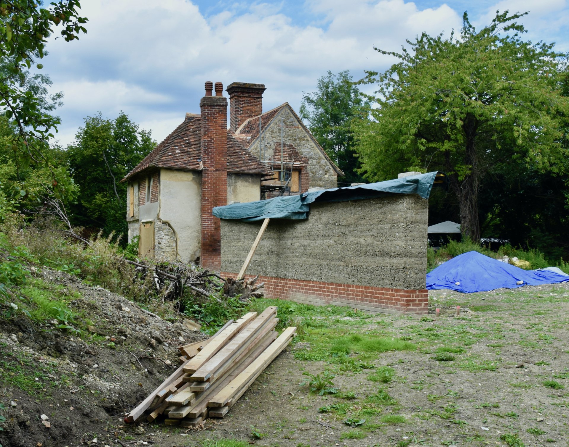 The biggest change to the site occurred with the construction of a new three-metre-high wall of rammed earth. The wall, built under the supervision of expert Rowland Keeble, used carefully prepared subsoil from the site. This was rammed into place within shuttering. The wall will support a covered walkway with solar panels above, but it also offers a sustainable solution to the problems created by the nearby motorway. Behind the wall is an area of garden that will be acoustically buffered from motorway noise.